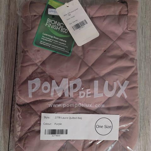 Pomp de lux rund skulderveske i svart for jente Vesken har en rund form med brodert logo på forsiden og en justerbar skulderrem med mønster. ,