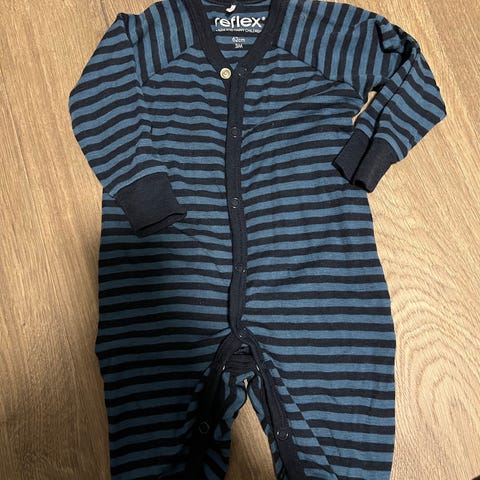 Selger en blå heldress/pysj i bomull i str 62 (3 mnd) fra Reflex. Plagget er lite brukt og er kun vasket med parfymefri såpe.
