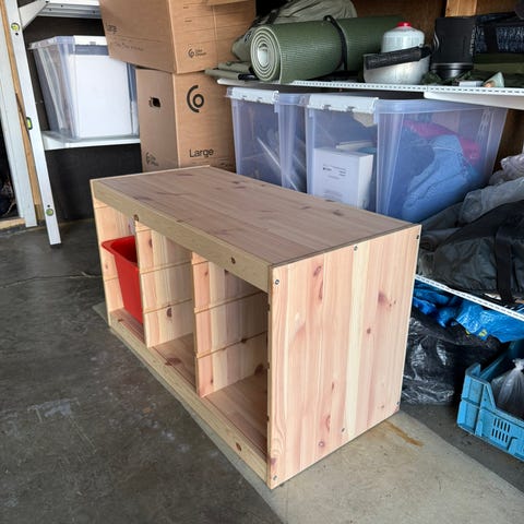 Vintage IKEA hylle i tre - demontert, mangler noen av stammene