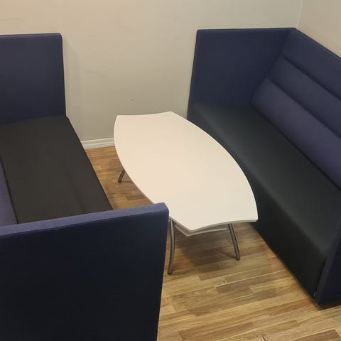 2 stk Vitra Alcove Highback Sofa med høy rygg i grått stoff. Sofaen har et moderne design med horisontale sømmer og innebygd bord i svart materiale. Egnet for kontor- eller loungemiljøer hvor avskjerming og komfort er ønsket. Sofaen har noen mindre bruksmerker på bordets kant.