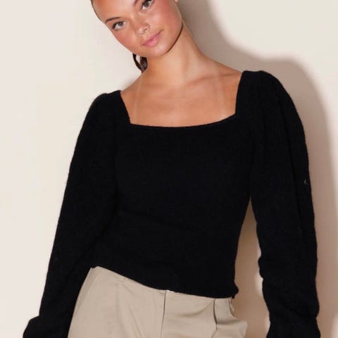 Ny ubrukt Babyalpakka genser med flott utrigning og snøring på innsiden av ermene, den kan justere armlengden. Den kan også brukes off shoulder.