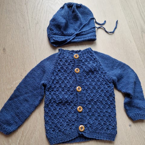 Nydelig hjemmestrikket jakke og lue selges til 150 kr. Jakka vil jeg si er ca 3-6/9 mnd (pluss). Lua er mindre, og passet ikke på min 6 mnd gamle baby 😊