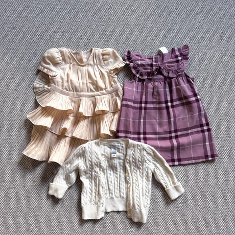 Selger 3 kjoler og 1 søt snekkerbukse m volanger.
