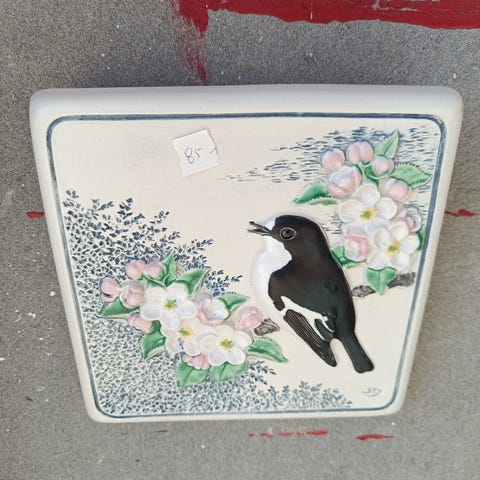 Bredde på fat med fugl 32 cm, høyde 53 cm. Vakkert og søtt.