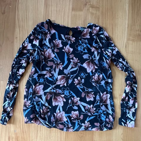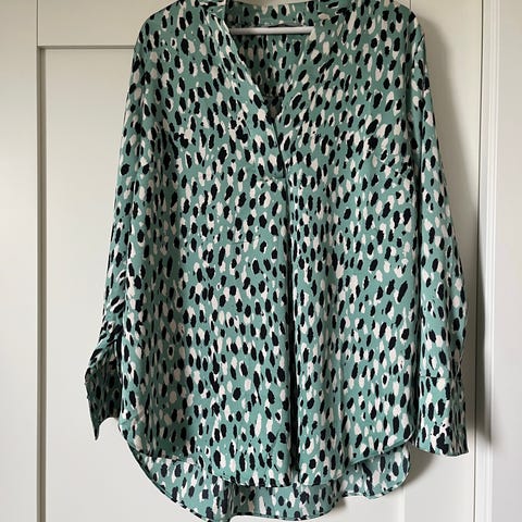 H&M bluse i flerfarget mønster, laget av 100 % viskose. Blusen er i størrelse 46 for kvinner og har lange ermer. Stilig knappestolpe på ryggen