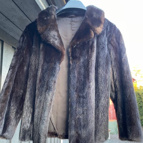Vurderer å selge ekte revepelsjakke i størrelse S.