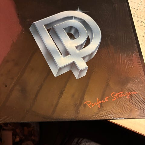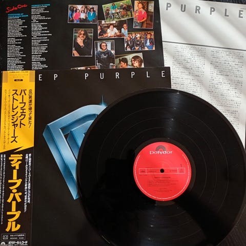 Deep Purple Perfect Strangers vinyl LP album. Features the band's classic rock tracks. The cover shows the band members and the iconic Deep Purple logo. Suitable for collectors and fans of rock music.
