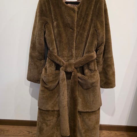 En legglang, enkeltspent kåpe i myk teddy med store lommer. Ledig passform med avtakbart knytebelte i midjen og enkel splitt bak. Fôret.
