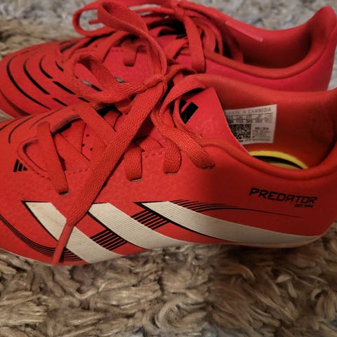 Adidas AdiNova størrelse 30. Skoene har gummisåle med knotter for bedre grep på kunstgress og gressbaner. Materialet er syntetisk med tekstilfôr, designet for innendørs og utendørs fotballspill.