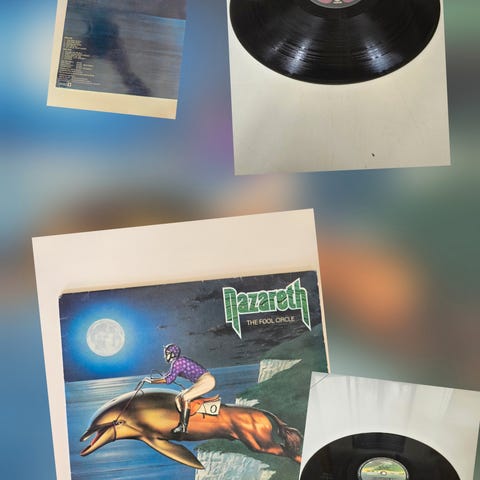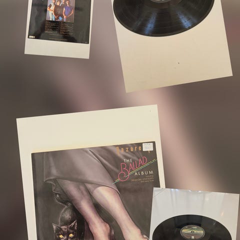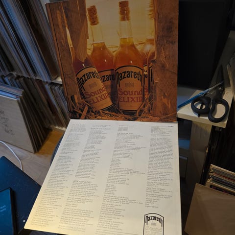 Nazareth Sound Elixir Vinylplate med cover som viser flasker med etiketten 'Sound Elixir'. Platecoveret har et rustikt tema med halm og flasker, og inkluderer tekst på baksiden.