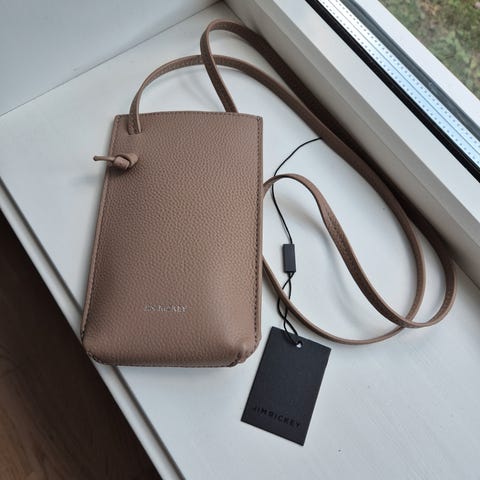 En kul, miniveske i strukturert, beige kvalitetsskinn med avtagbar skulderreim. Ett hovedrom med plass til for eksempel mobil og ytterrom til andre småting. Baksiden har kortlommer og plastlomme til ID. Glidelås på ytterrom og magnetknapp på klaff. Regulerbar skulderreim i sort med skinndetaljer. Logo i gullfarge foran og gullfargede metalldetaljer.