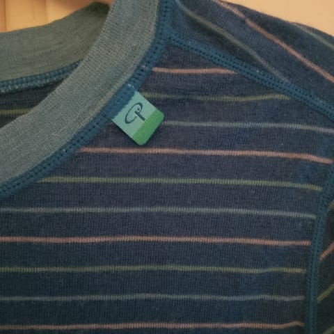 En av dem har to små hull på siden. Dessverre ble de lyse trøyene vasket sammen med mørke klær og har fått farge. Men de fungerer fortsatt fint til formålet sitt. Alle tre selges for 250 kr.