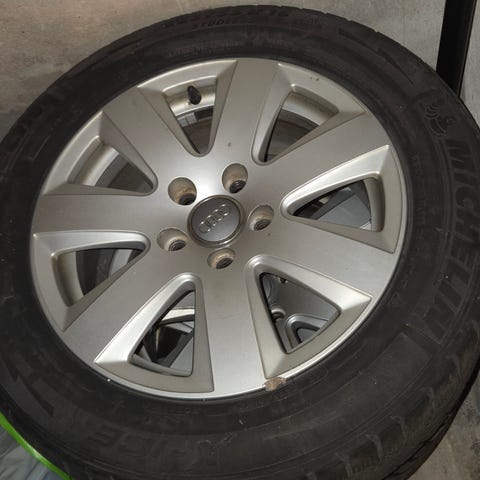 3 stk komplette dekk +1 dekk ødelagt men felg er ok. Stått på Audi A6 2006 model. Mønster er 7mm.