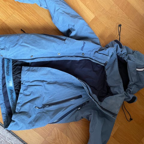 Bergans M jakke i blå farge, størrelse M. Jakken er vannavstøtende og har hette. Egnet for utendørs bruk og varierende værforhold. Perfekt til ski - snøvær