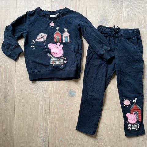 Pent brukt Peppa gris joggedress fra name it. Str 92. Er et lite hull på låret, dette har ikke utvidet seg, kan enkelt sys et par sting også. Se bilde.