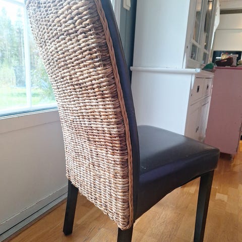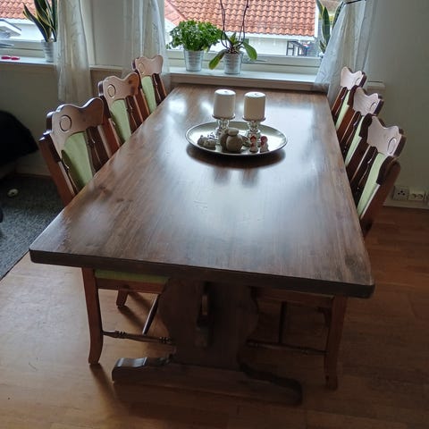 Bombay spisestue med 7 stoler selges. Bordet er 2 meter langt og 1 meter bredt, 75cm høyt. Følger med 7 stoler, de er orginalt i sort skinn, men per nå er det avtagbare sorte stoff trekk på de. Vært trofast i mange år, men absolutt mye bruk igjen. Stolene har noen bruksmerker , men fortsatt mye god mat og gode samtaler på de rundt bordet. Må hentes i Drangedal.