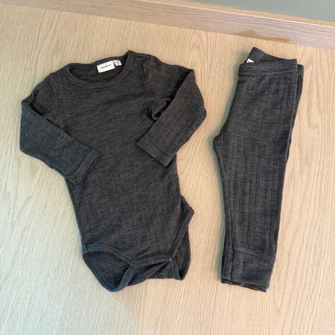 Name it ullsett. Fint brukt, men har fått 3 mikroskopiske hull ser jeg nå når jeg studerte det. Se bildene. To på buksa og et på bodyen
