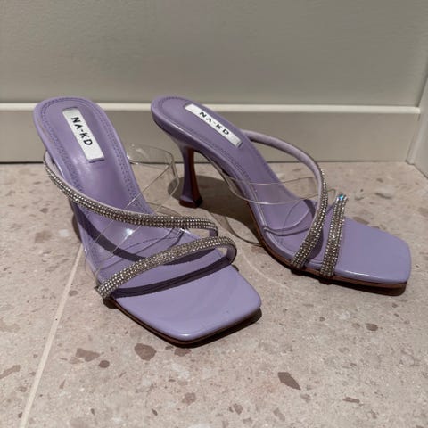 NA-KD Hæler i størrelse 38 med rosa metallic farge. Skoene har spiss tå og snøring rundt ankelen. Materialet har en skinnende, metallisk finish som gir et unikt utseende.