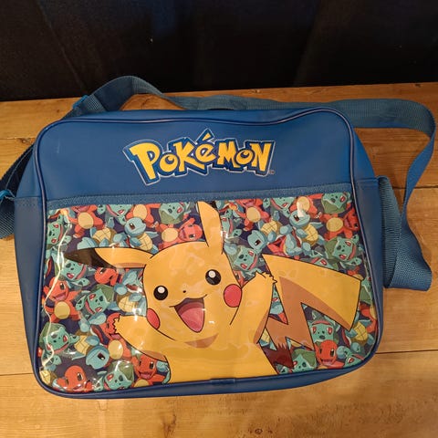 H&M Pikachu stoffveske i gul farge med justerbar sort stropp. Vesken er unisex og har motiv av Pikachu fra Pokémon på forsiden. Egnet for oppbevaring av små eiendeler og til bruk som en praktisk og lett bæreveske.