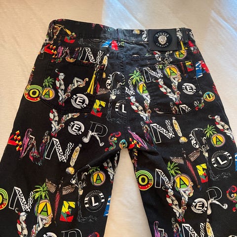 Selger et par fargerike og luksuriøse Versace badeshorts. Denne modellen har den karakteristiske elastiske linningen med det greske Greca-mønsteret og Medusa-hodet sentralt. Perfekt for strandlivet eller bassengkanten.