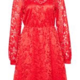 Stoffet er tøyelig, svart i bunnen med rødt mønster og skrukker ikke.