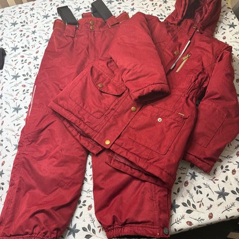 Det står ikke merke eller størrelse inni jakka og buksa, så jeg sender med mål på dem.