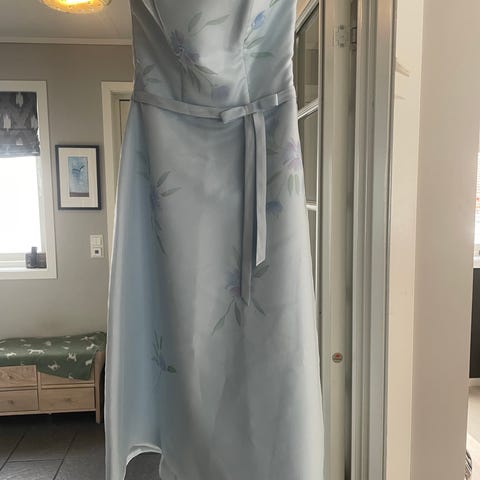 Flott navyblå kjole med lite slep bak fine detaljer som perler rundt halsåpning og i livet. Fin passform.