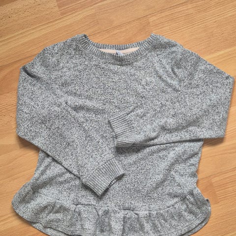 Ribbet genser i 100% merinoull. Super myk, klør ikke. Bittelitt misfarge oppe ved halsen, men synes ikke godt.