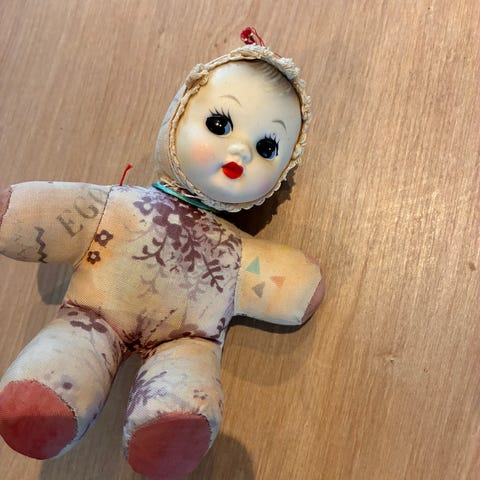 Antikk dukke Boudoir, med stoffkropp og silkekjole