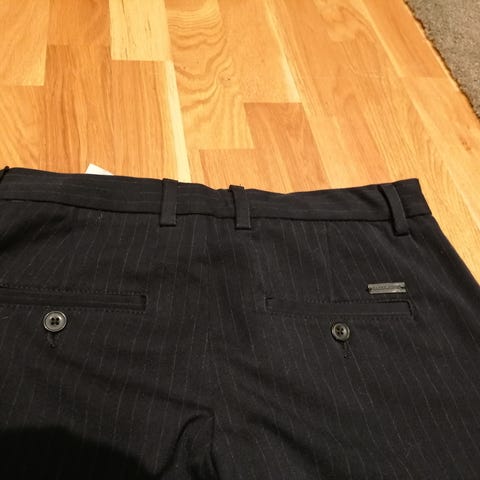Buksen er ettersittende og har svært mye stretch. Meget behagelig på – føles nesten som en joggebukse, men sitter som en pen slim-fit dressbukse.