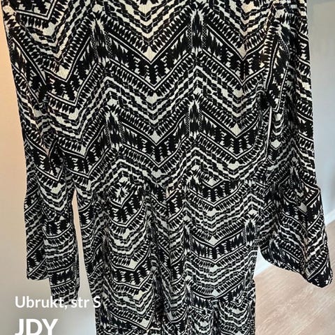 Hverdagskjole i størrelse S for kvinner med flerfarget mønster. Kjolen har lange ermer og et elastisk midjebånd som gir form. Stoffet har et dekorativt blomstermønster i varme farger.