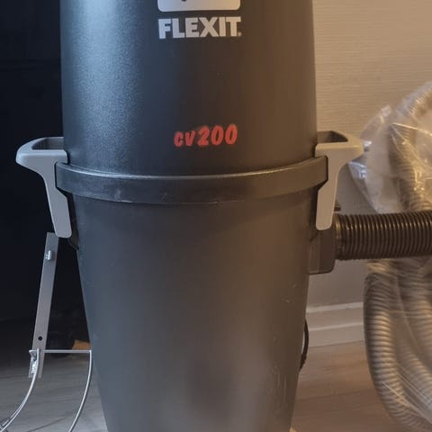 Flexit CVR 2000 sentralstøvsuger. Enheten er beregnet for fast montering som del av et sentralstøvsugeranlegg i bolig eller tilsvarende lokaler. På bildet følger det med støvsugerslange, gulvmunnstykke, mindre munnstykke og strømledning. Passer til bruk der det allerede er installert røropplegg for sentralstøvsuger fra Flexit eller kompatibelt system.