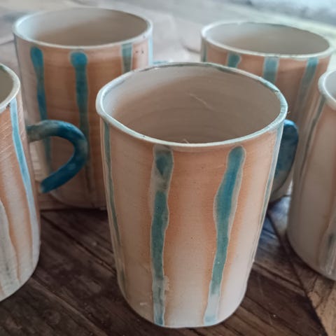 Fem ubrukte keramikkrus selges kr. 1000,-.