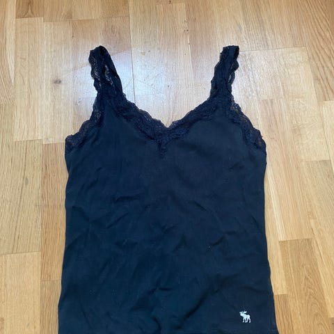 Abercrombie & Fitch Singlet i størrelse XL, hvit farge, laget av ribbet stoff. Singlet har blonder langs halsen og skulderstropper, og et lite brodert logoemblem nederst på plagget.