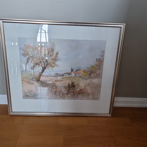 Maleri som viser et landskap med trær, vann og himmel i olje på lerret. Bildet har en rektangulær form og er innrammet i en enkel ramme. L=90 H=50 D=4