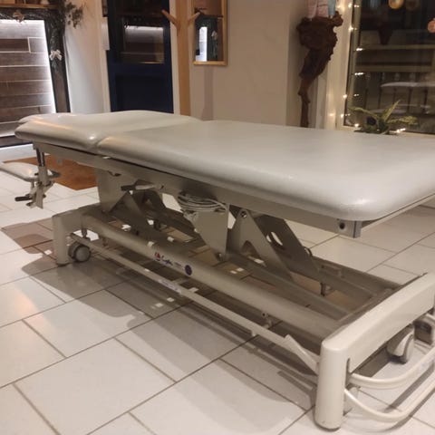 Selger min kjekke og lettvekt elektrisk justerbar behandlingsbenk. Benkens høyde kan enkelt reguleres med fjernkontrollen.