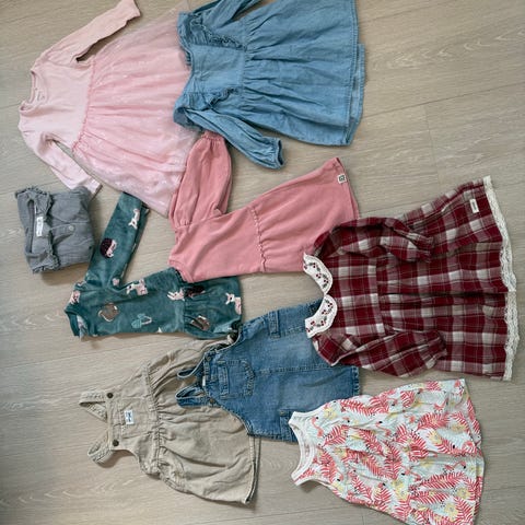 Legger med en omtrent ubrukt dongerijakke og en fin rosa trenchcoat.