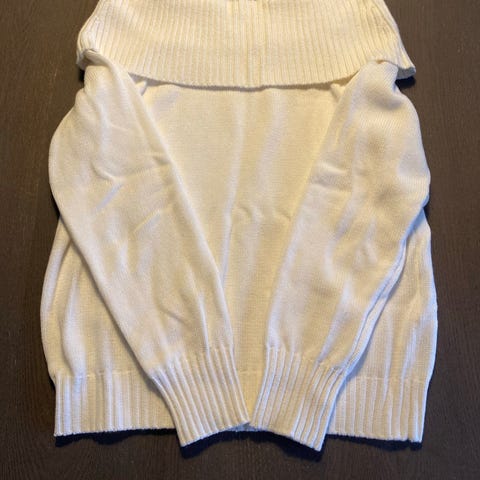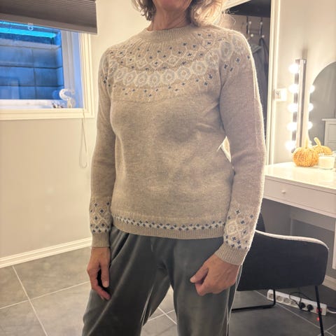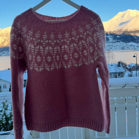 Va Vite Genser i størrelse M for kvinner. Genseren er rød med mønsterdetaljer i flere farger rundt hals og ermer. Materialet er ullblanding. Genseren har et tradisjonelt mønster og langermet design. Veldig pent brukt.