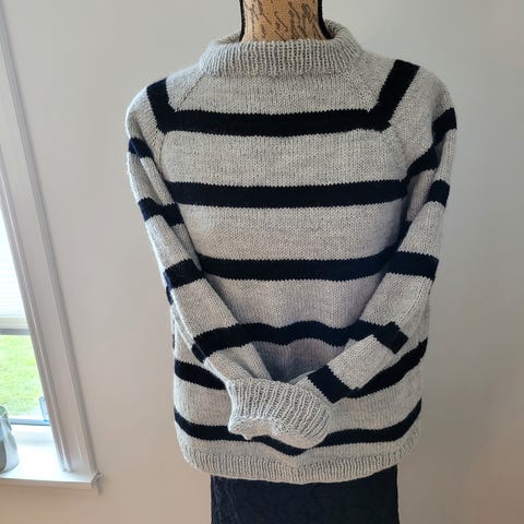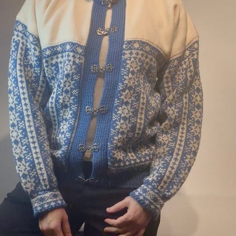Lotus blomst kofte strikket i fin ullgarn. Blå og hvit