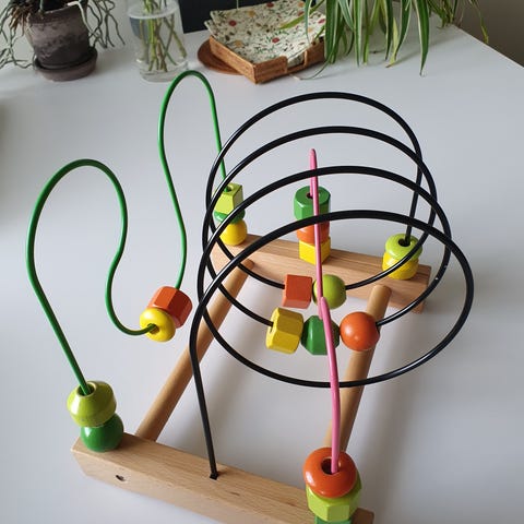 Ikea kule labyrint. Laget av tre med fargerike perler på bølgende metallstenger. Designet for små barn for å stimulere motoriske ferdigheter og koordinasjon.