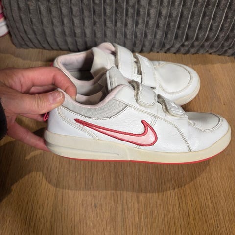 Nike barnesko i størrelse 28, designet for unisex bruk. Skoene har hvit og rød fargekombinasjon med borrelås for enkel lukking. Materialet inkluderer tekstil og syntetiske komponenter, egnet for daglig bruk. Skoene er sparsomt brukt som innesko.