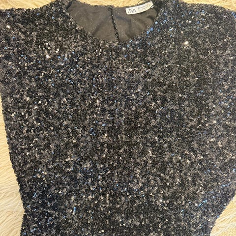 Det er glitter foran og vanlig collage bak og på ermer. Ermene er også 3 kvart i lengde.