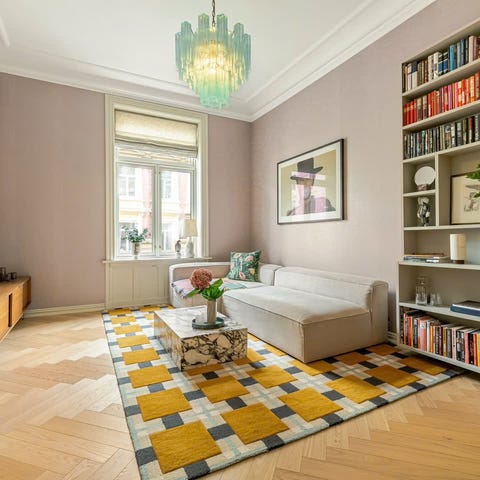 Dette teppet ble kjøpt hos Steen & Strøm for ca. 25–30 år siden og er av høy kvalitet. Fargene i blå, rustrøde og beige toner skaper et elegant og samtidig livlig uttrykk som passer både klassiske og moderne interiører.