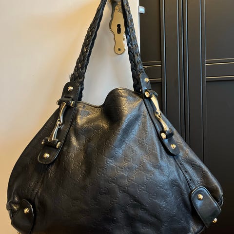 Bottega Veneta Dame Skinnveske i svart Deerskin « Cervo Woven Cocker Hobo Nero Black « vesken er autentisk. Se bilder- kontroll- lapp. Vesken er myk med flettede detaljer og i flettet skinn på håndtaket. Innvendig er vesken foret med lyst semsket skinn og har en glidelåslomme. Svært få bruksmerker. En skatt av en veske som bare blir liggende i oppbevaringspose. Kun brukt få ganger i selskap. Retro. Kjøpt brukt av meg for noen år siden. Har ikke kvittering. Bare spør ved behov for flere bilder.Lengde 24 cm- høyde 16 cm- bredde 12 cm- skulderstropp 17 cm. Messing detaljer. Lommer med trykk- knapp på hver side. Fint om henvendelsene er seriøse. Pris kan diskuteres.