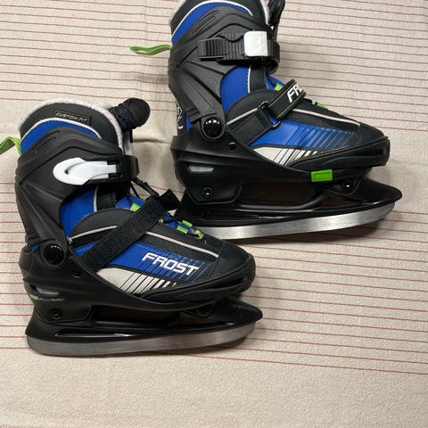 Frost barneskøyter i størrelse 28, designet for barn. Skøytene har en kombinasjon av rosa og grå farger og er laget av plastmateriale med tekstil innvendig. De har justerbare spenner for god passform og støtte, egnet for ulike skøyteaktiviteter.