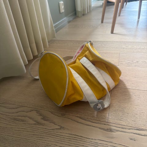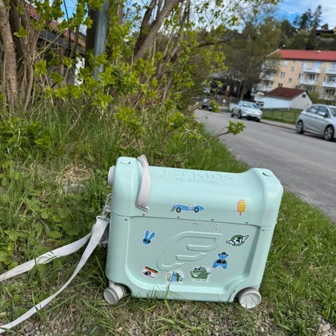 Fin mørkegrønn som har en liten skade på begge fremhjulene som gjør at det er vanskelig å dra i den når barne sitter på den, men kan ennå fint brukes som en vanlig reise koffert. Eventuelt hvis man er handy så kan man sikkert fikse den. (Seb bilde)