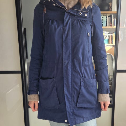 Str. S. Begge sidelommene har glidelås. Innerlomme med glidelås. Hette som kan rulles inn i kragen (og lukkes med glidelås)