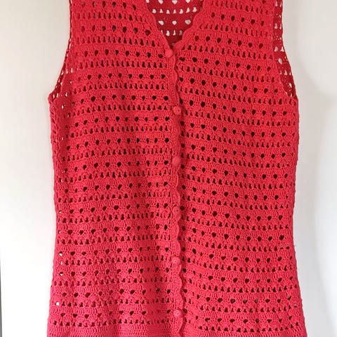 heklet cardigan, ofte omtalt som en "granny square" cardigan, som er et populært plagg innenfor bohemsk og vintage-inspirert mote.