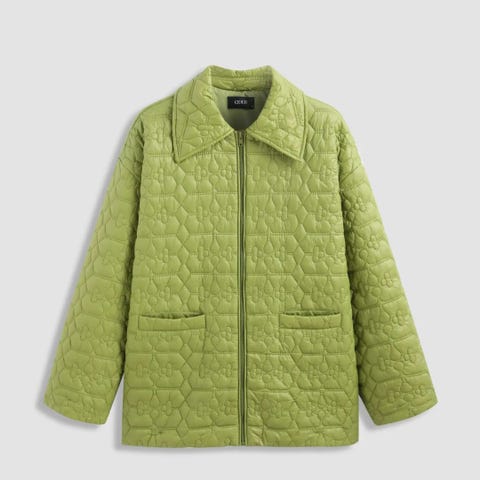 Jakken har et quiltet mønster, krage og knappelukking foran. Laget for å gi lett isolasjon og komfort.