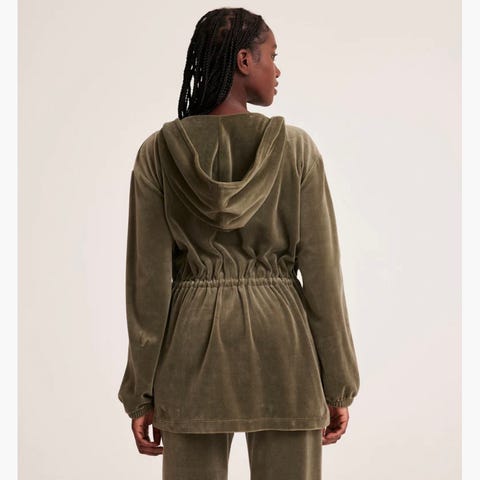 Laget i et mykt materiale med dekorative volanger langs åpningen og lommer foran. Passer til hverdagsbruk og kan kombineres med ulike antrekk.